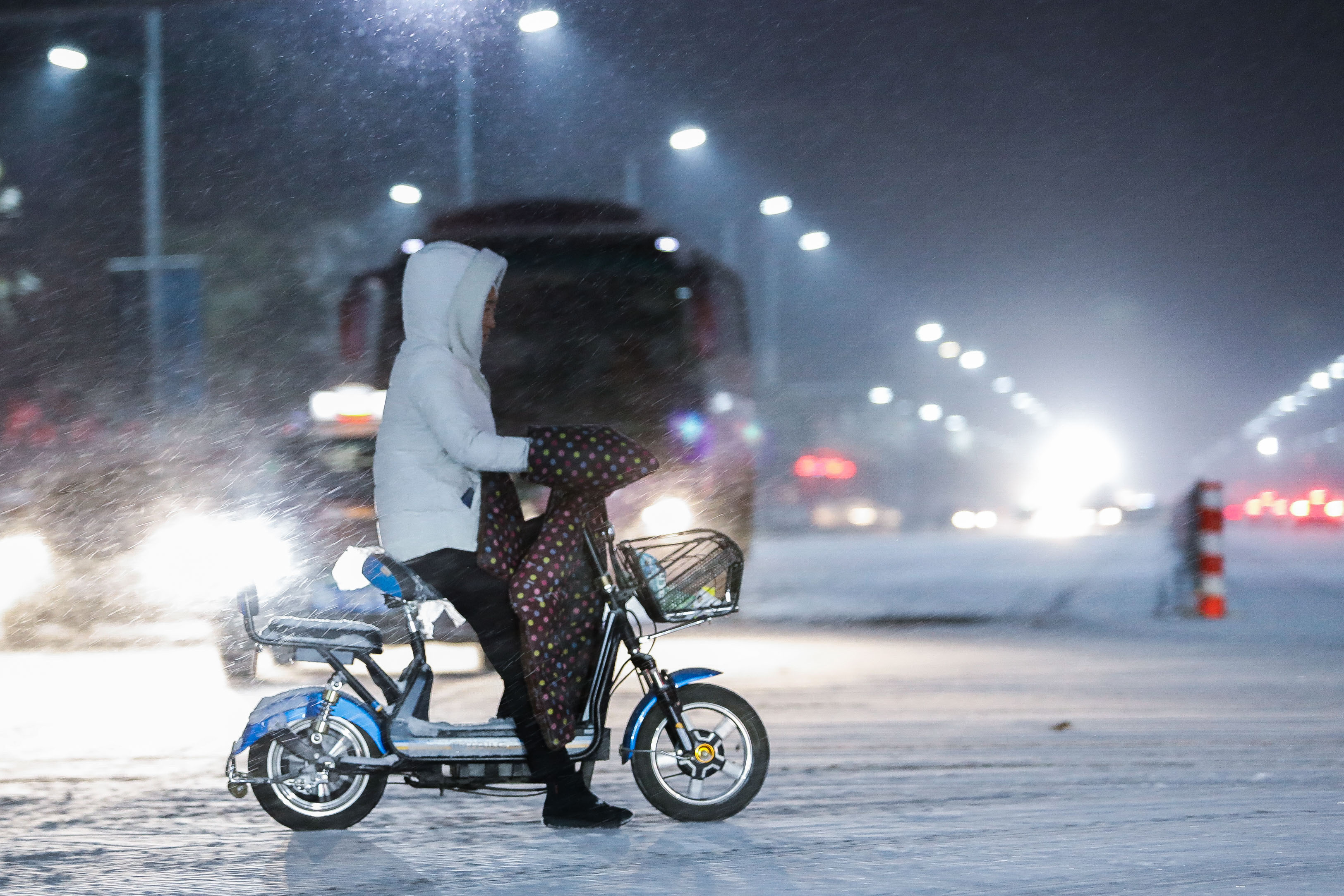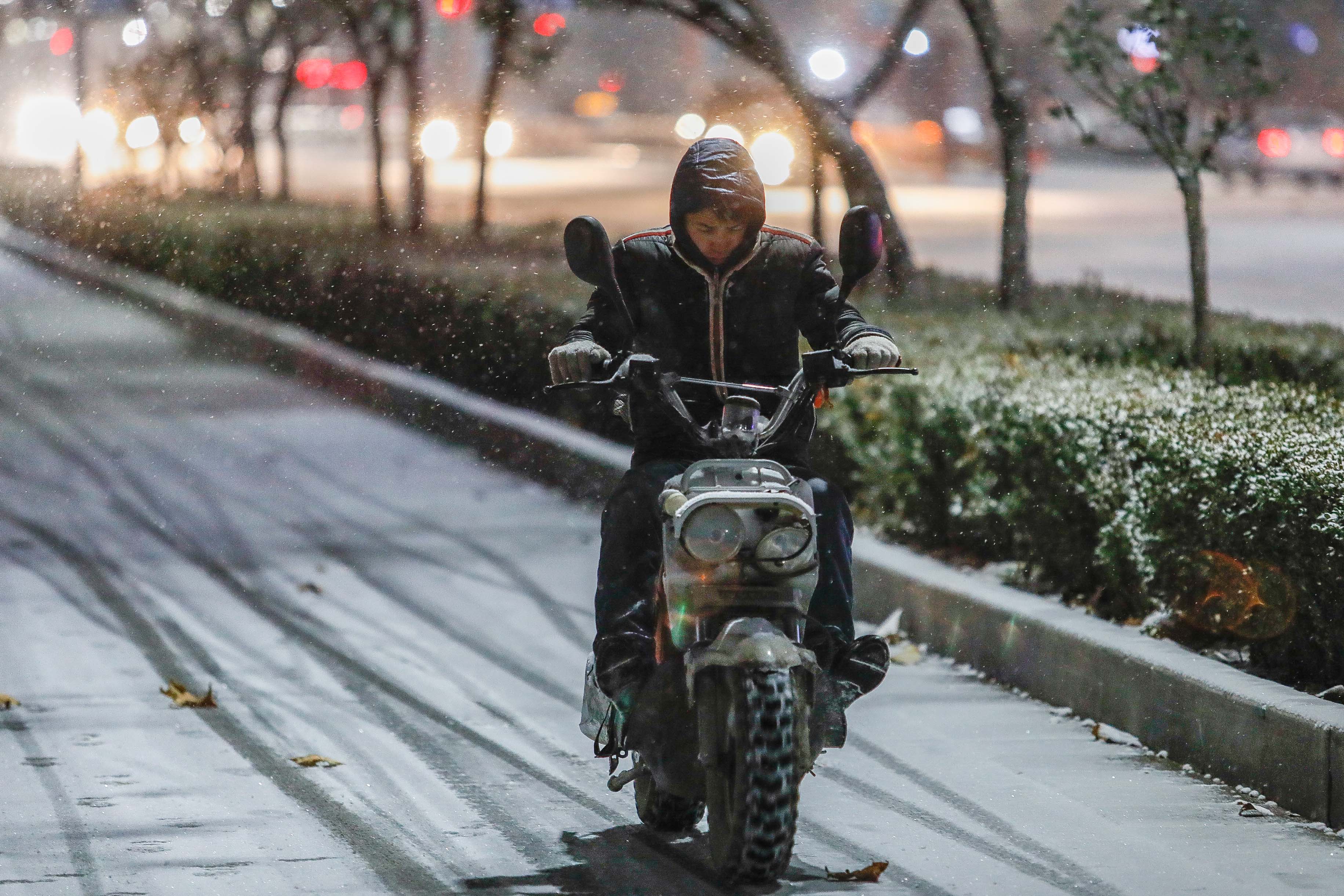 一位路人在雪中艰难骑行,由于气温低道路已结冰过往车辆纷纷降速。