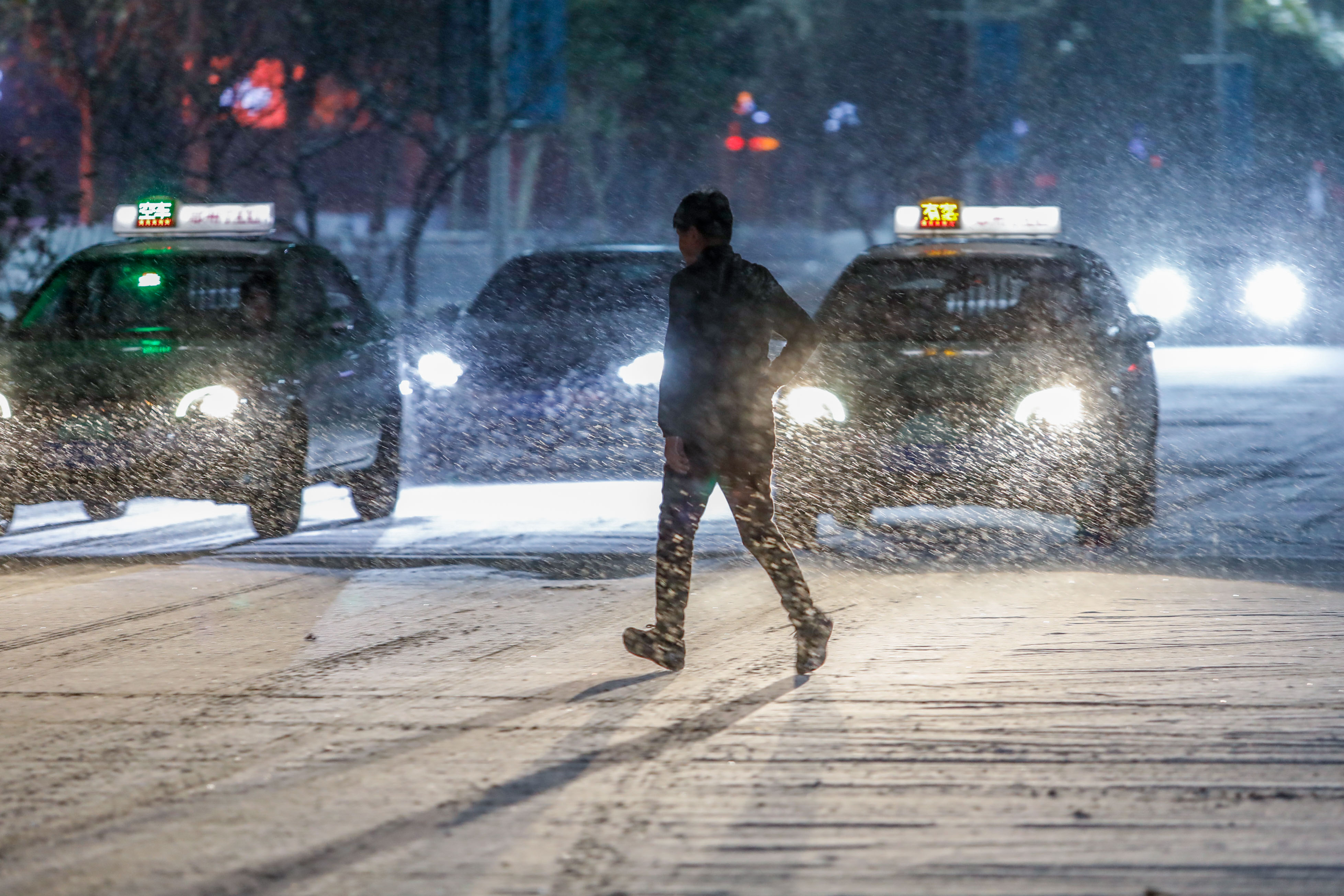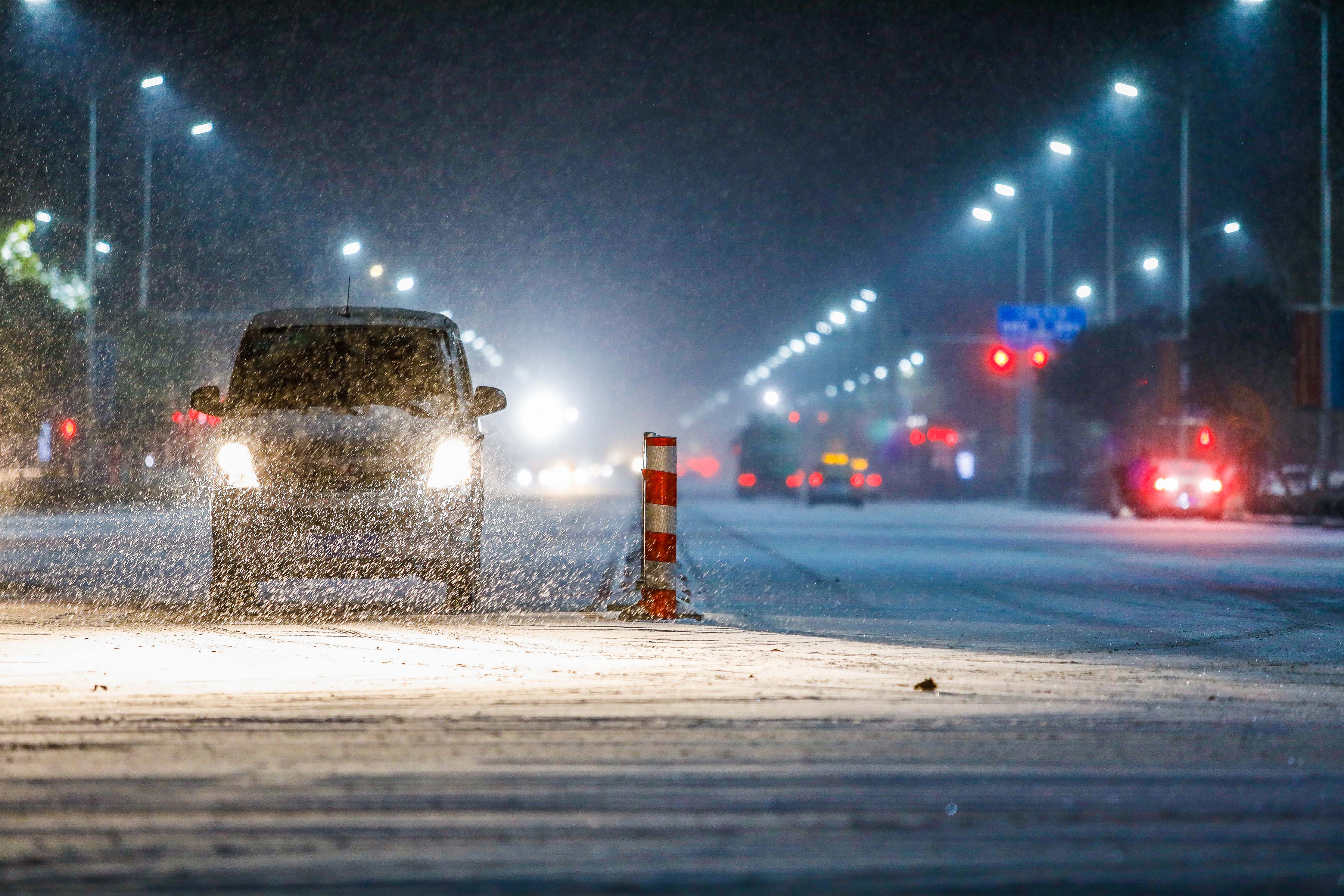 道路已被积雪所覆盖,过往车辆纷纷降速。