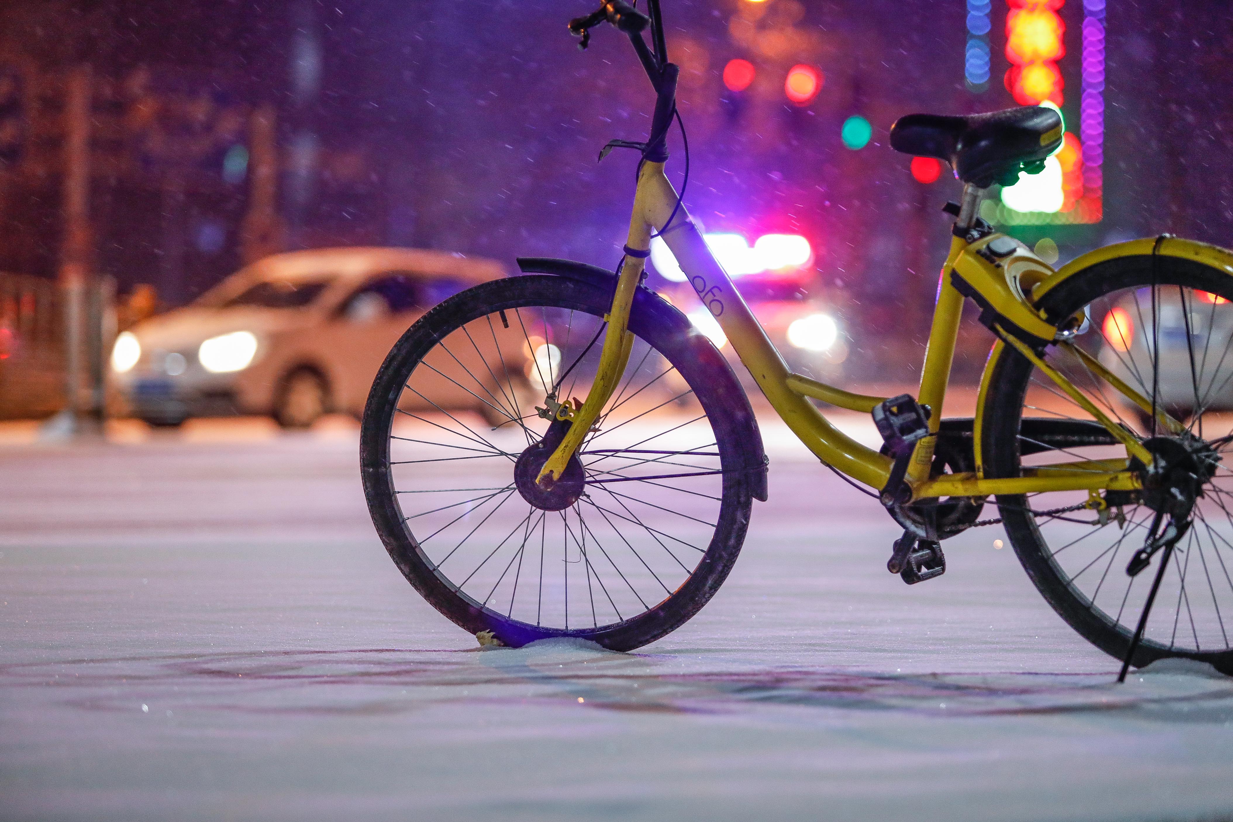 雪中的小黄车,迎着飞舞的雪花整个世界彷佛静止一般。