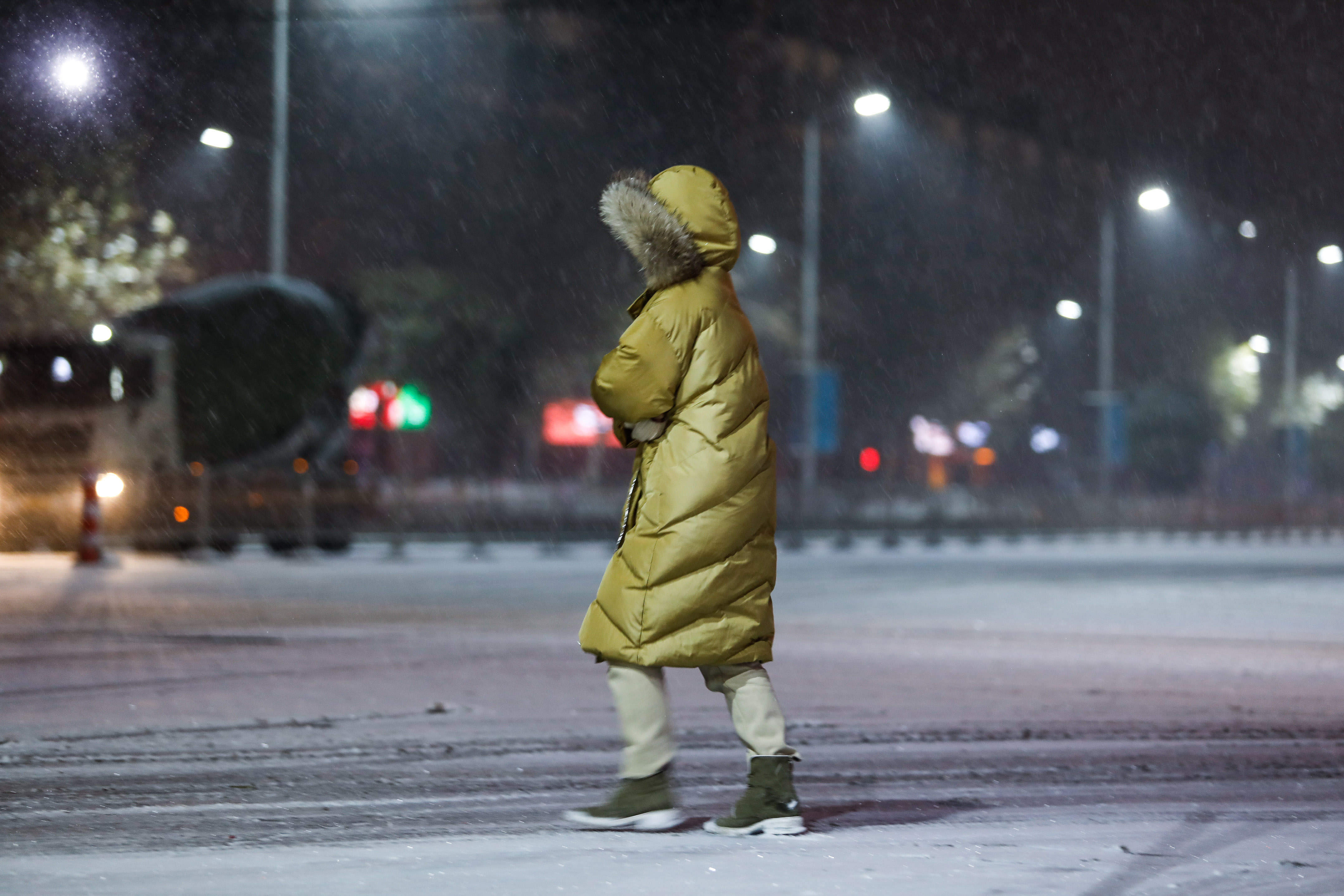 一位路人紧裹着衣服匆匆赶路,伴随着降雪郑州的气温也将跌破-10℃。