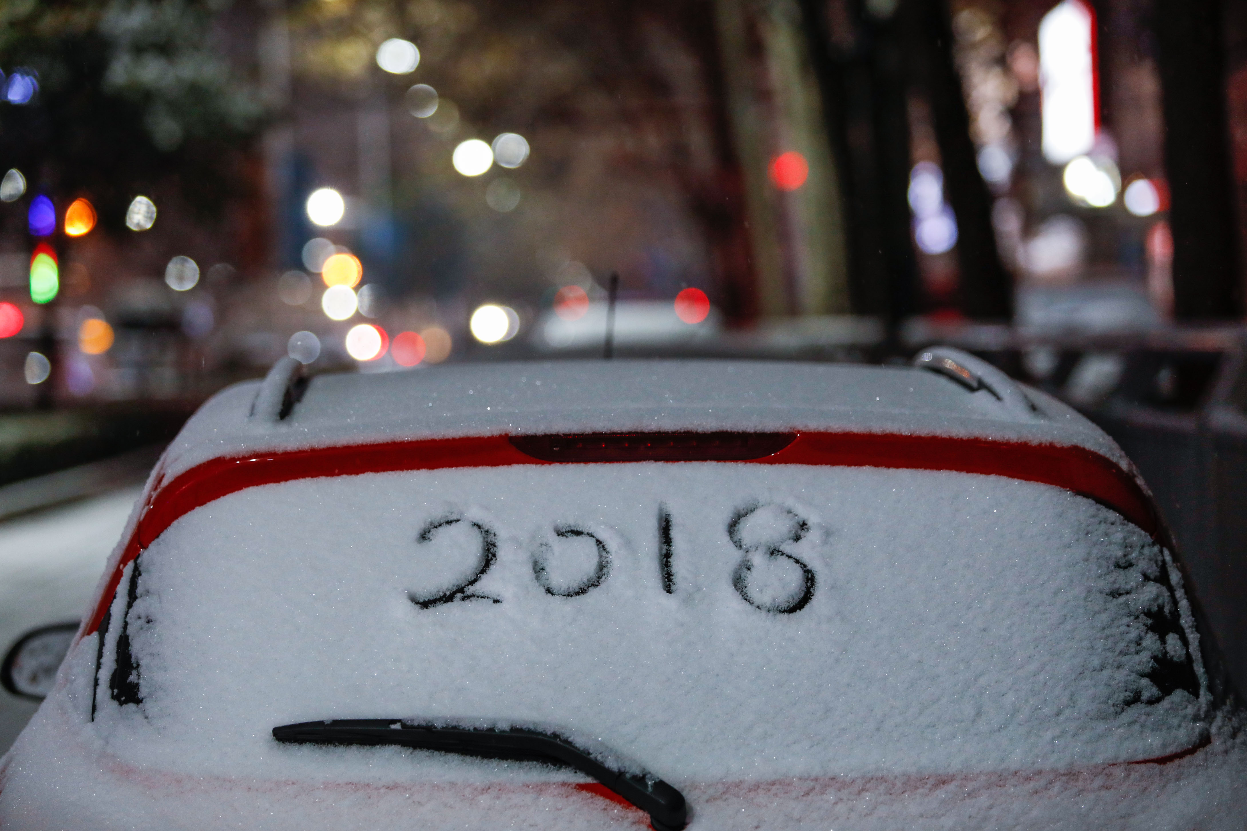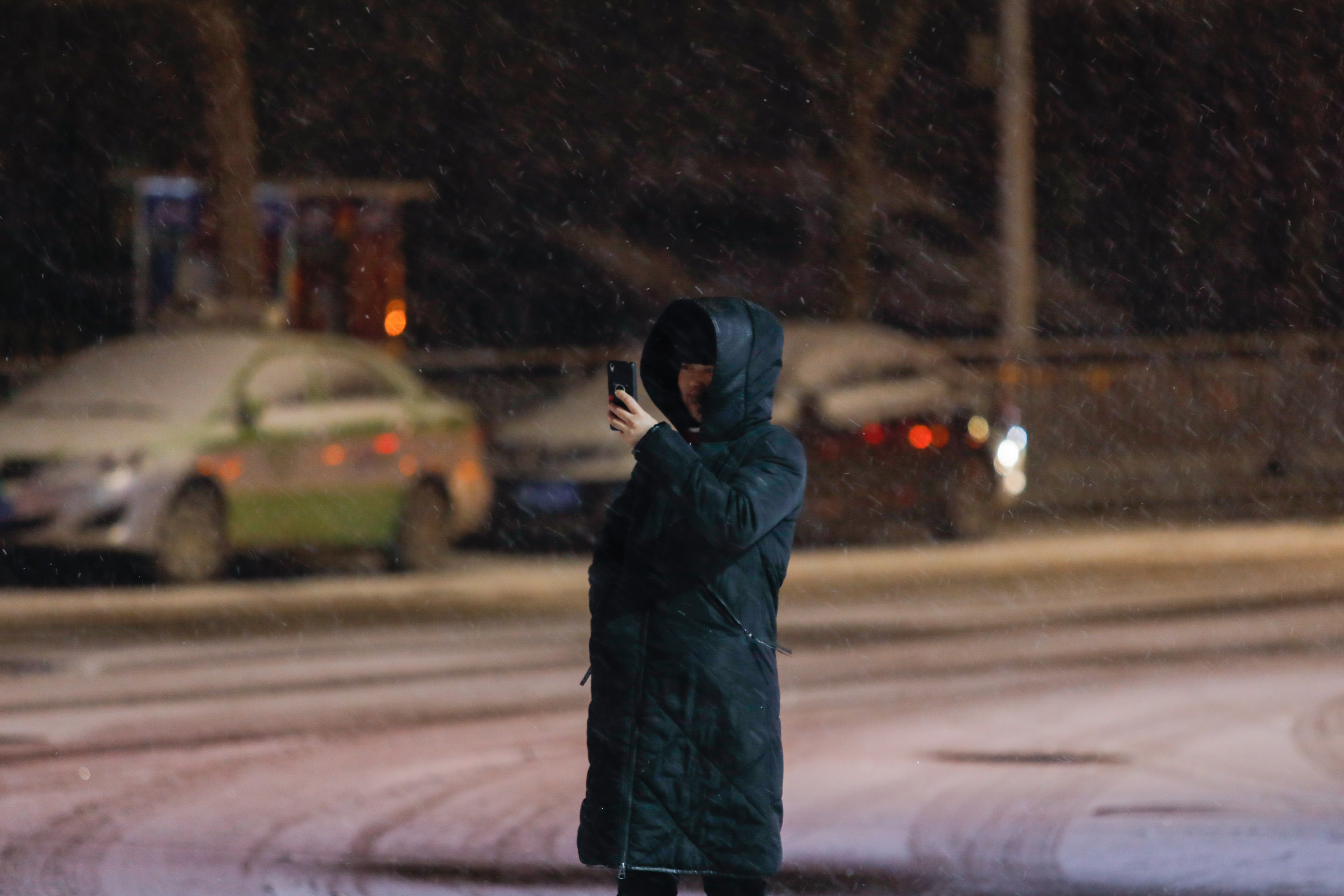 一位路人不畏严寒,用手机记录着2018年的第一场雪。