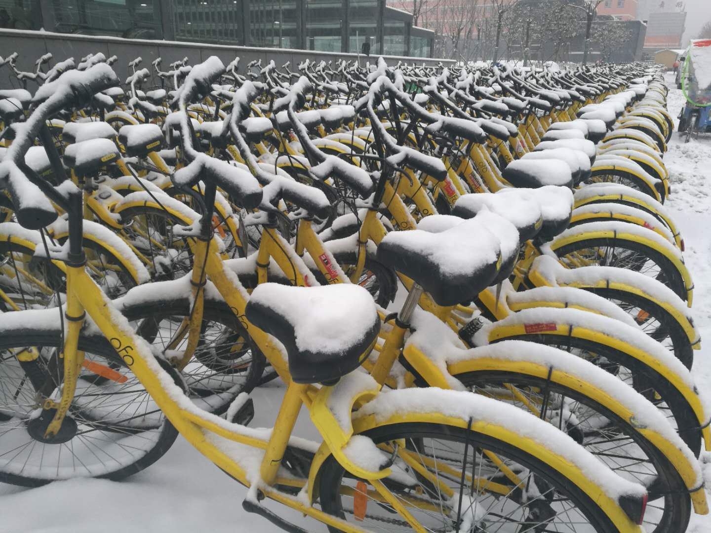 自行车上落满积雪,整齐停放在路上