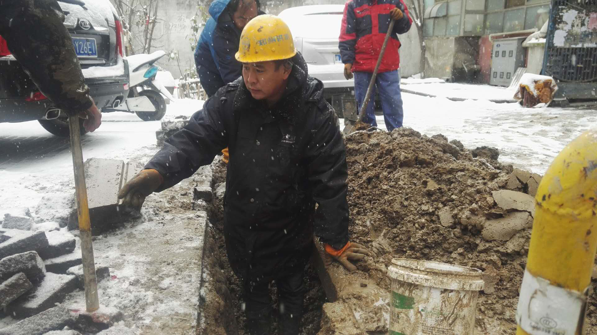 由于路面积雪,小区院内通道又狭窄,挖掘机无法使用,维修人员只能人工开挖。天气寒冷,暴雪纷飞,维修人员在极寒天气下,挥舞着铁锨、榔头,一点点的开挖操作坑。经过努力,漏点显示出来了,关口开裂导致漏水。维修工郭格、王景科等人顾不得泥泞和寒风,轮流下到坑底操作,将早已准备好的抢修节准确无误地包裹在开裂处,漏水止住,供水恢复!
