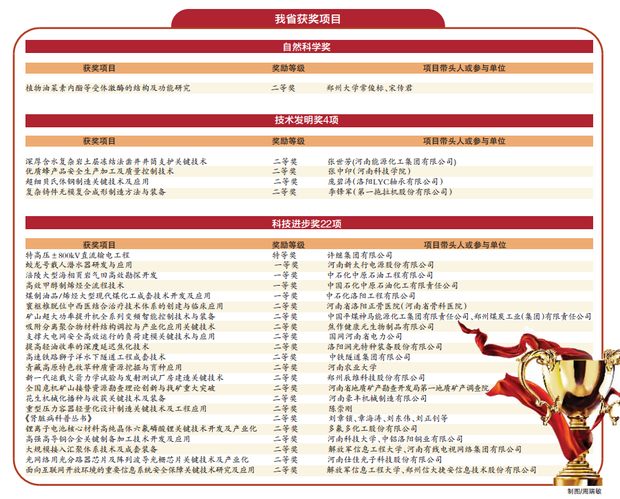 该年度国家科学技术奖励,河南斩获颇丰,共有27个项目获奖。其中,国家自然科学奖1项,国家技术发明奖4项,国家科技进步奖22项;按牵头情况分,我省推荐和主持项目有7项,参与项目有20项。