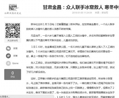 1月1日晚,《金昌日报》官方微信报道了此事后,1月2日,甘肃电视台、兰州晨报、兰州晚报等媒体纷纷跟进。1月3日,中央电视台新闻频道《新闻直播间》栏目报道此事。一时间,“红裤头”救人的事迹,在金昌市乃至整个甘肃省引起了强烈的反响。在官方微信平台上,有上百条留言,大多是为“红裤头”小哥点赞的。不少人希望找到这个不愿留名的英雄。为此,《金昌日报》以及当地媒体纷纷发起“寻找红裤头好人”“寻找冰窟救人的无名英雄”的寻人启事。