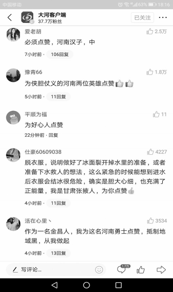 昨天,大河报记者粗略翻看网友评论发现,为这两位河南老乡点赞的评论中,“侠肝义胆”“善良”“英雄”等词汇占的比重最多。