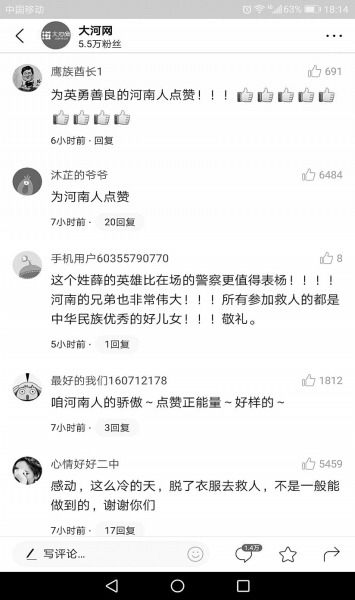 网友@平凡的驻马人:每当出现人命关天的危险时刻,时常能看到奋不顾身、挺身而出的河南人的身影。为勤劳、善良、勇敢的河南人点赞!
