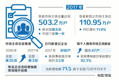 截至2017年底,我省市场主体总量达到503.2万户,创下新高。我省市场主体迸发巨大活力的原因何在?市场主体在质和量上又呈现出哪些新特征、新优势?1月16日,记者采访相关专家,为大家解读数据背后的故事。
