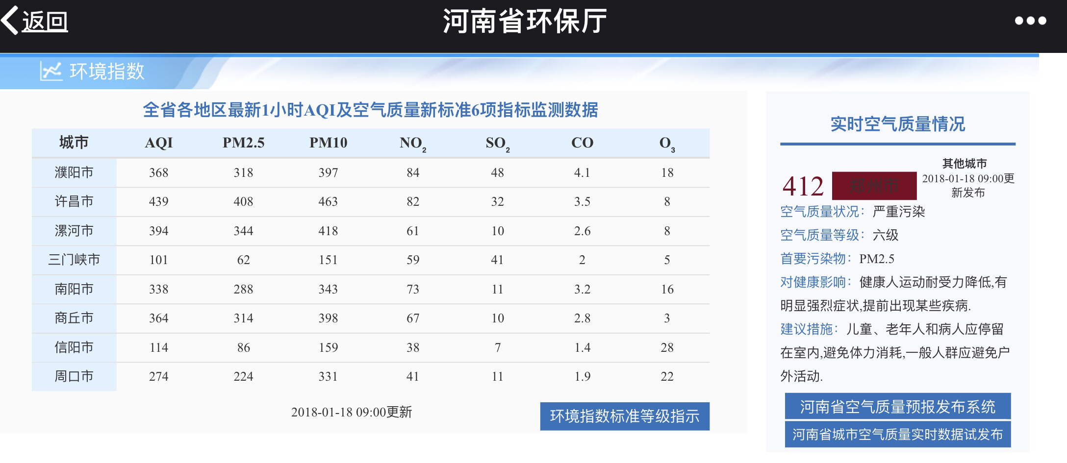 愿望是美好的,现实是残酷的,大河网记者从河南省环保厅网站上看到,1月18日上午9点实时空气质量检测结果显示,郑州市AQI数值410,首要污染物为PM2.5,空气质量状况为严重污染。而记者从河南省气象台获悉,19日、20日,雾霾将再度加重,又将是"蒙蒙哒"的一天。