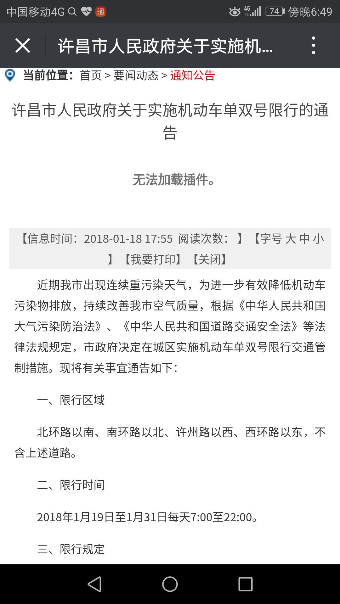 本次限行政策限行区域 包括北环路以南、南环路以北、许州路以西、西环路以东,不含上述道路,限行时间为2018年1月19日至1月31日每天7:00至22:00。