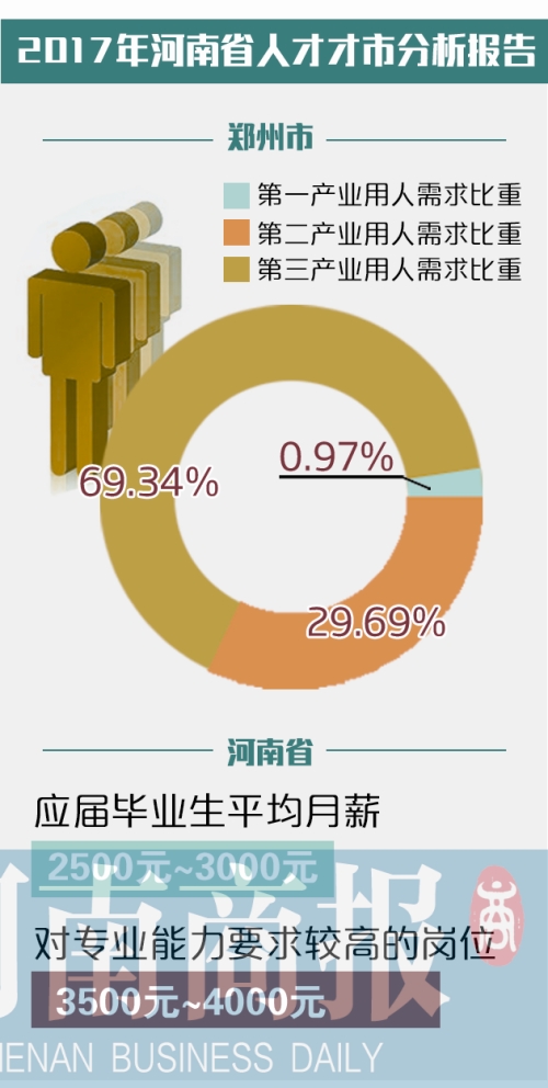 第三产业就业人数较2016年继续上升,成为就业主力。尤其是郑州市,第一、二、三产业用人需求比重分别为0.97%、29.69%、69.34%。