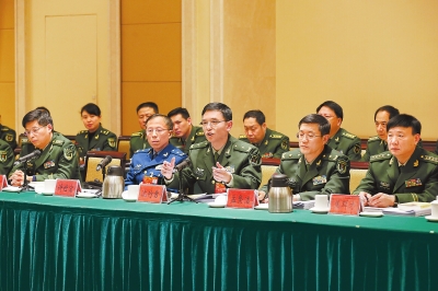 ◀1月27日,出席省十三届人大一次会议的解放军武警代表团的代表们在认真审议政府工作报告、省人大常委会工作报告和两院工作报告。⑨6本报记者董亮摄
