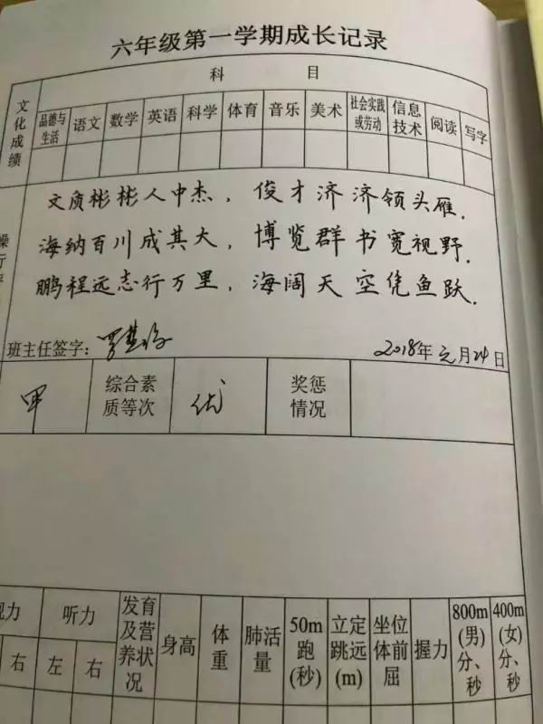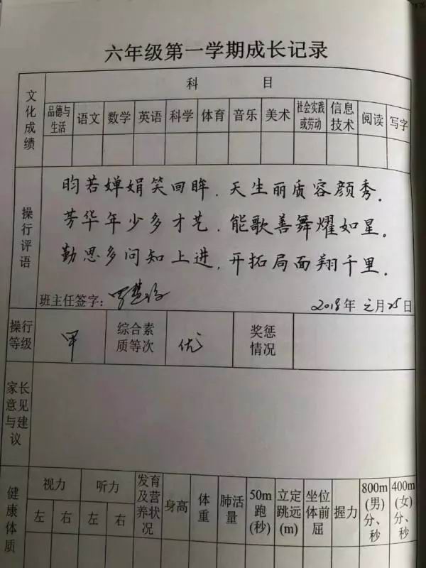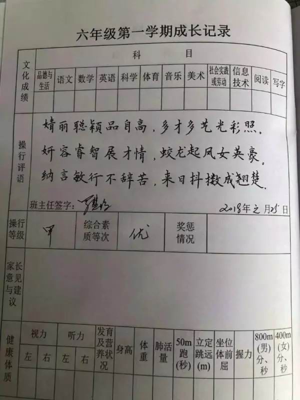 日前,一小学六年级教师火了。用七言诗句给学生写评语,字还超美。