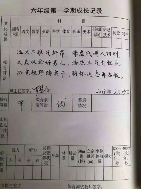 据@赣州发布 消息,赣州于都县天润学校六年级教师罗慧琼老师“诗性大发”用端正秀气的硬笔书法书写,将操行评语浓缩为精炼的七言诗句,并且诗句里还植入了孩子的名字。