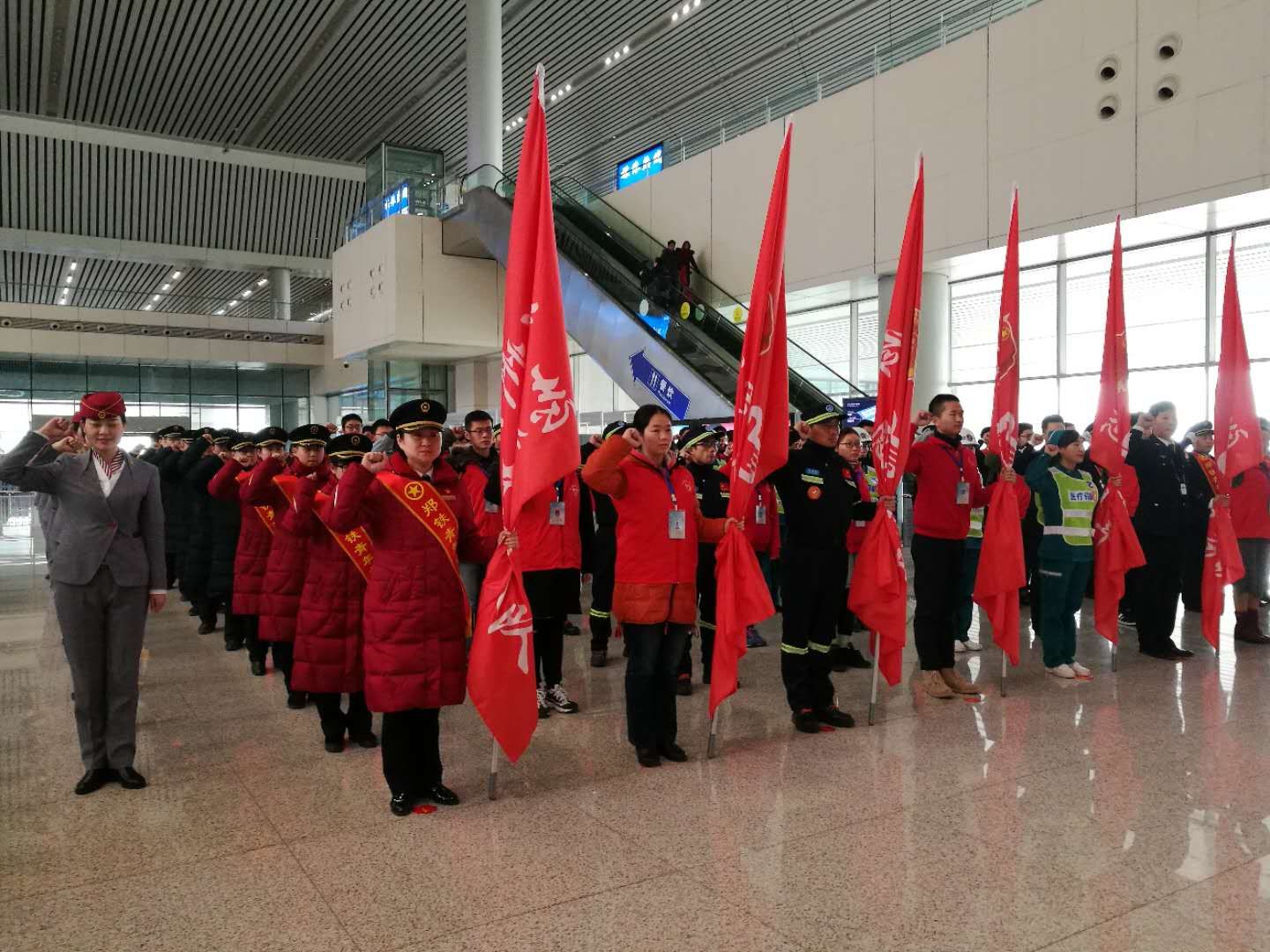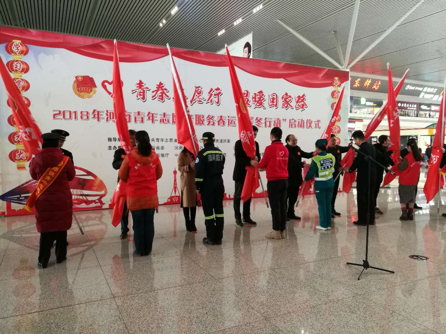 仪式结束后,志愿者进行了应急救护展示,与会领导看望慰问了郑州东站心馨党员服务台、安检等岗位工作的青年志愿者和青年职工,并送上保温杯、志愿者吉祥物等新春礼包,一幅幅喜庆的春联也被送到来往旅客的手中。