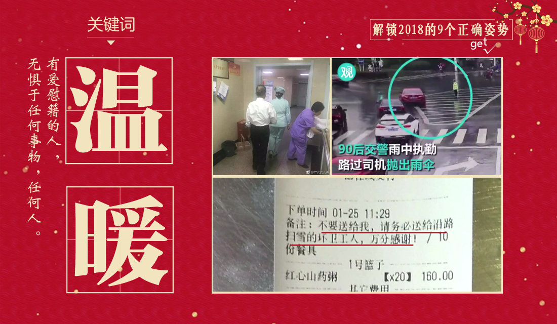 地铁里,他紧扶住轮椅,直到残疾乘客下车;公路上,他奋力掰开破碎的车窗,不顾双手已被割破;暴雨的街头,他徒手清理下水道,被雨水浇透...他们,是我们身边素不相识的陌生人,他们,虽平凡却温暖了我们――我们的城市有高度,有速度,更要有温度,期待新一年的我们都有一份属于自己的温暖,也不吝惜将这份温暖传递给他人,更期待这份温暖能抵达你我的心底,成为我们大步向前的力量。?
