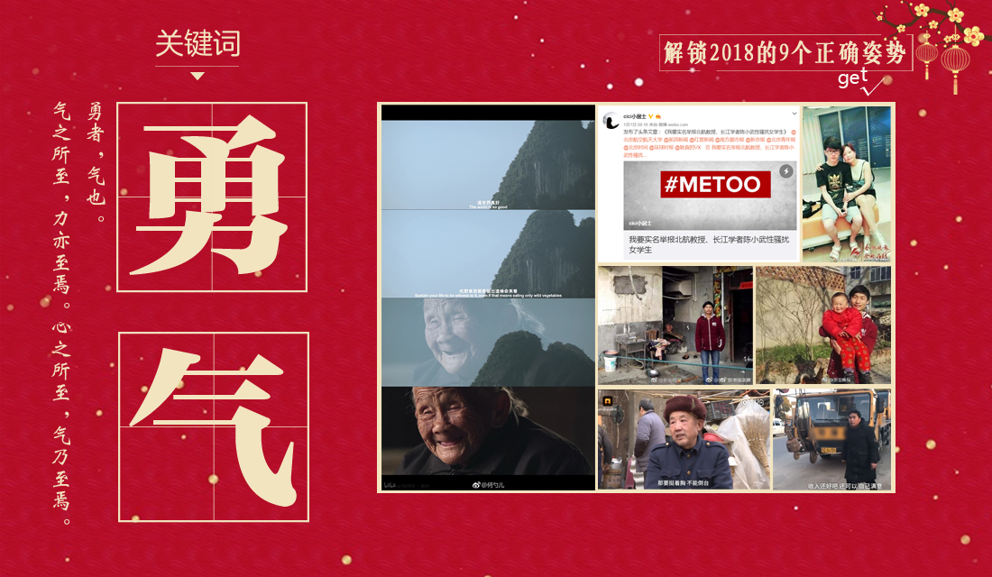 见义勇为是一种勇气,直面生活,直面痛苦更是一种勇气,拾荒8年,替跑路老板偿还大部分债务的芜湖老人代传华说:“要挺着胸往前走,见事往后退,那咋行?”实名公开举报教授性侵的女博士罗茜茜说:“我们要勇敢地站出来,说No!”纪录片《三十二》,受过诸多不幸的奶奶说:“这世界真好,吃野东西也要留出这条命来看。”