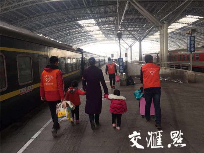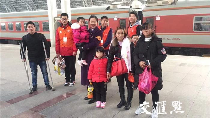志愿者和车站工作人员帮助贵州六盘水一家人登火车。