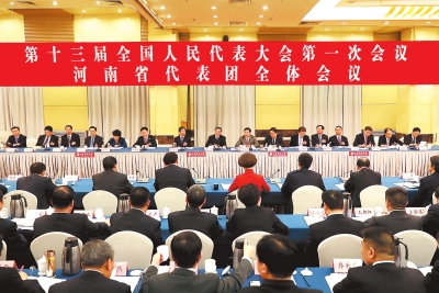 3月10日,出席十三届全国人大一次会议的河南代表团传达学习习近平总书记参加山东代表团审议时的重要讲话精神。⑨3本报记者董亮杜小伟摄