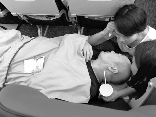 “老伴,你怎么了,快醒醒啊!”一声紧急呼叫声响彻整个机舱,正在休息的郑州大学第一附属医院肿瘤科五病区的护士李莉莉赶忙奔到患者跟前。一位60岁左右的男士(即孙君敖)突发疾病晕厥,面色苍白,大汗淋漓。