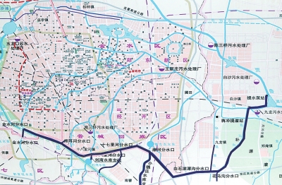 蓝色粗线指的是,圃田泽将作为环城生态水系循环工程重要一环,为城市河渠提供循环水源。