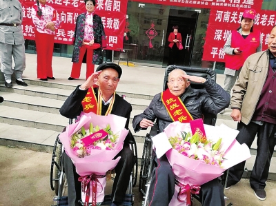 下午2点,在信阳市平桥区养老服务中心院内,来自平顶山、信阳两地的关爱抗战老兵志愿者、养老中心的老人们,以及信阳市平桥区人武部、教体局的工作人员在这里见证了这一激动而又幸福的时刻。
