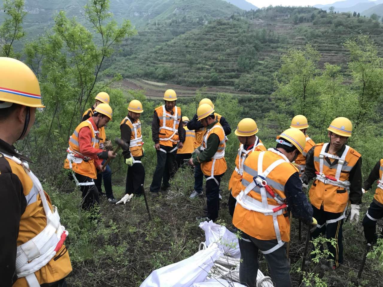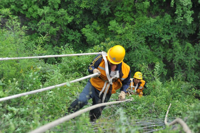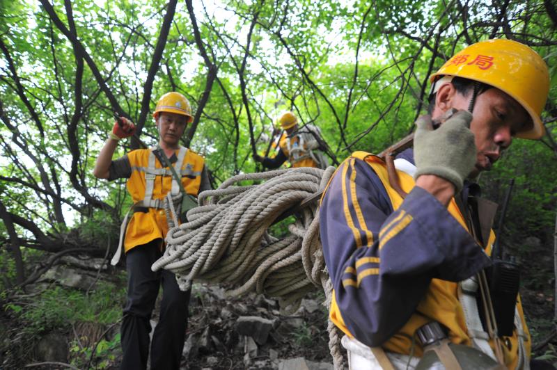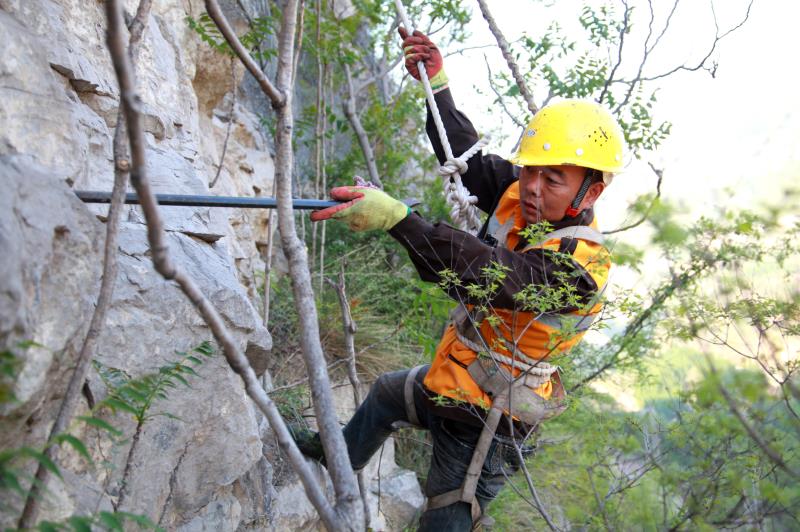把两根绳子分别在钢钎上系好,侯法宝和另外三个职工按照分工,坐在山上各自拉住一根绳子。那一头,胡军已经系好安全绳和保险绳,在两根绳子的保护下,走向悬崖。