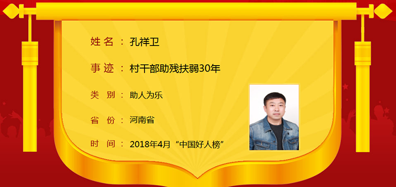 “助残扶弱30年,润物无声爱无边。”30年来,孔祥卫坚持关注帮扶残疾人、老年人和社会困难群体,被当地百姓成为“活雷锋”。