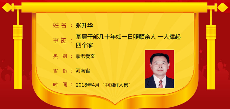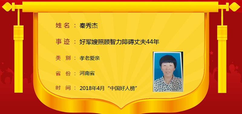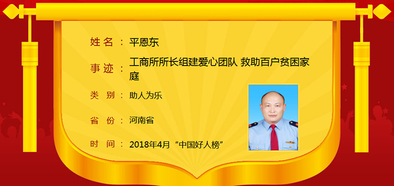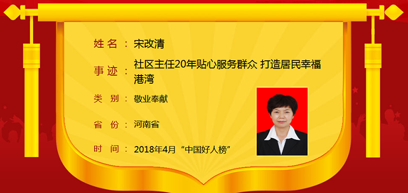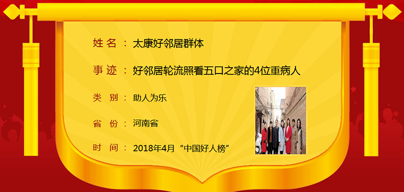 4月28日,2018年4月“中国好人榜”发布仪式暨全国道德模范与身边好人现场交流活动在天津市和平区举办,共有104位助人为乐、见义勇为、诚实守信、敬业奉献、孝老爱亲的身边好人荣登该榜,河南省有8人1集体光荣上榜。他们分别是助人为乐好人:轮流照看五口之家4位重病人的好邻居太康好邻居群体;组建爱心团队,救助百户贫困家庭的工商所所长平恩东;助残扶弱30年的村干部孔祥卫;成立水上救援队,坚持义务救援服务群众的退伍战士岳星。见义勇为好人:休假时遇火灾,三入火海救人不幸牺牲的年轻战士李道洲。敬业奉献好人:20年贴心服务群众,打造居民幸福港湾的社区主任宋改清;15年无悔坚守一线的女法医徐海霞。孝老爱亲好人:几十年如一日照顾亲人,一人撑起四个家的基层干部张升华;照顾智力障碍丈夫44年的好军嫂秦秀杰。