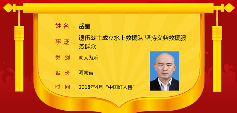 2016年12月,在他人的帮助下,岳星投资10余万元成立郑州市红十字水上义务救援队开封支队,一年多来,他带领队友先后参与义务打捞30余次,打捞尸体12具,始终坚持不收事主一分谢礼,不吃一顿宴请,所有救援均免费。本人先后荣获“河南省百佳志愿者”“郑州市红十字优秀志愿者”等称号。