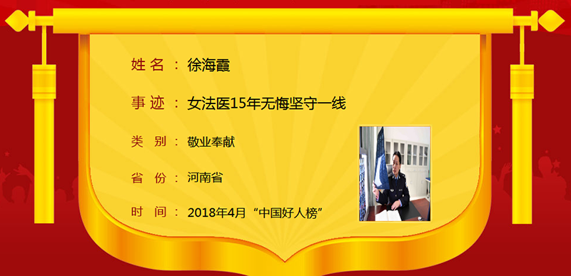 2003年,在沁阳看守所担任狱医的徐海霞调到刑侦大队当上了一名女法医。15年来,她凭着对法医事业的执着追求和无限热爱,刻苦钻研,兢兢业业,出勘各种现场4000多个,出具法医鉴定书3000余份,检验各类物证2000余次,检验各类尸体870例,为多起案件的侦破提供了重要线索,同时也为法庭审判提供了有力的证据。2015年荣立个人三等功。