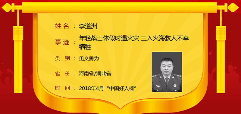 2018年3月3日下午,武汉市洪山区梨园街东湖花园小区一户居民家中突发大火,屋内堆积的大量废旧物品猛烈燃烧。正在休假的信阳光山籍战士李道洲看到火情后,不畏凶险,先后两次冲进火场救出一对年迈夫妇。当他第三次冲进火场继续救人时,由于火势凶猛,未能逃出火海,不幸罹难。当搜救人员发现李道洲遗体时,他仍背着被困女子,鼻子里都是黑烟。2018年3月5日,空降兵部队批准李道洲同志为烈士,共青团武汉市委追授他“武汉青年五四奖章”荣誉称号,3月8日,共青团信阳市委、信阳市青年联合会追授他“信阳青年五四奖章”。