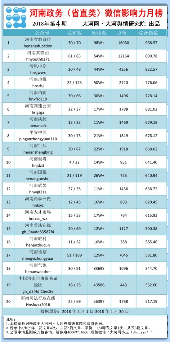 该榜单由大河网大河舆情研究院制作,监测对象覆盖了河南省境内较为活跃的政务(省直类)微信公号,监测周期为2018年4月1日至30日。如您有意推进智慧政务建设,或有意自荐将您所属政务(省直类)微信公号列入监测范围,请致电大河网客服电话:400-637-1669。(杨慧俊 谢珊 熊孟元)