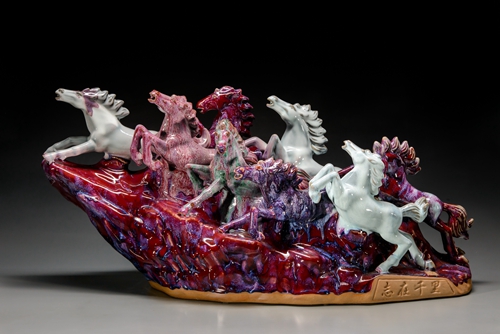 八骏马:作品以钧瓷的形式雕画了矫健的骏马,呈现了骏马奔腾、雷霆万钧的景象,表达了志在千里的雄心壮志。