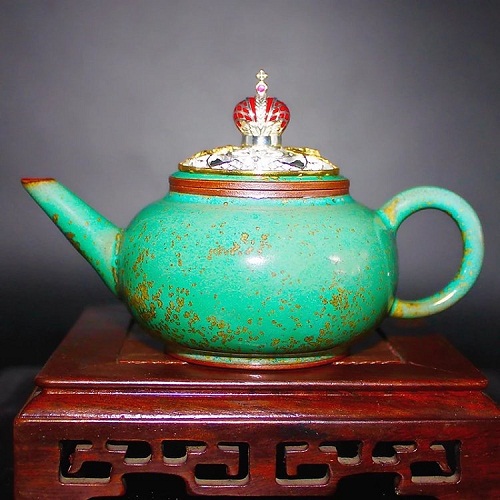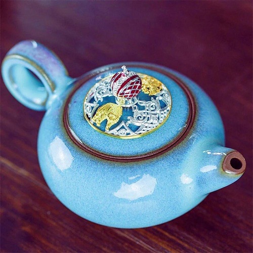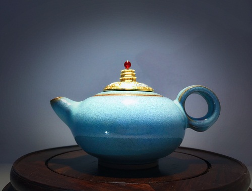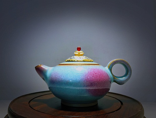 "皇世万钧"良知壶:融合中国钧瓷,皇家顶级花丝,宝石镶嵌,高级珐琅,鎏金工艺以致良知,敬天爱人为主体设计元素,是中国传统艺术融合之巅峰作品。