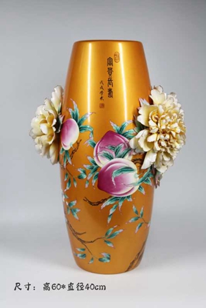 《釉上彩绘腰鼓花瓶》作品是捏塑、浮雕与釉上彩绘完美融合的艺术精品。作品中的牡丹竞相怒放,层叠的花瓣中漫浸着牡丹的雍容华贵。富贵之意尽在其中,硕大的的仙桃香气四溢,传送了富贵长寿之意。瓷韵花魂,亘古美丽。