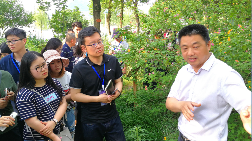 汉丰湖国家湿地公园负责人向媒体记者介绍湿地生态治理情况。
