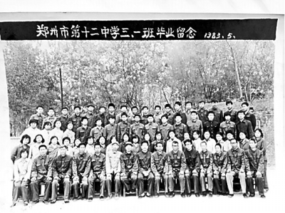 记者看到,这张照片最上方有一行字:“郑州市第十二中学三·一班毕业留念”,显示拍摄时间为1983年5月。照片最后一排,左起第二个就是孟文杰。