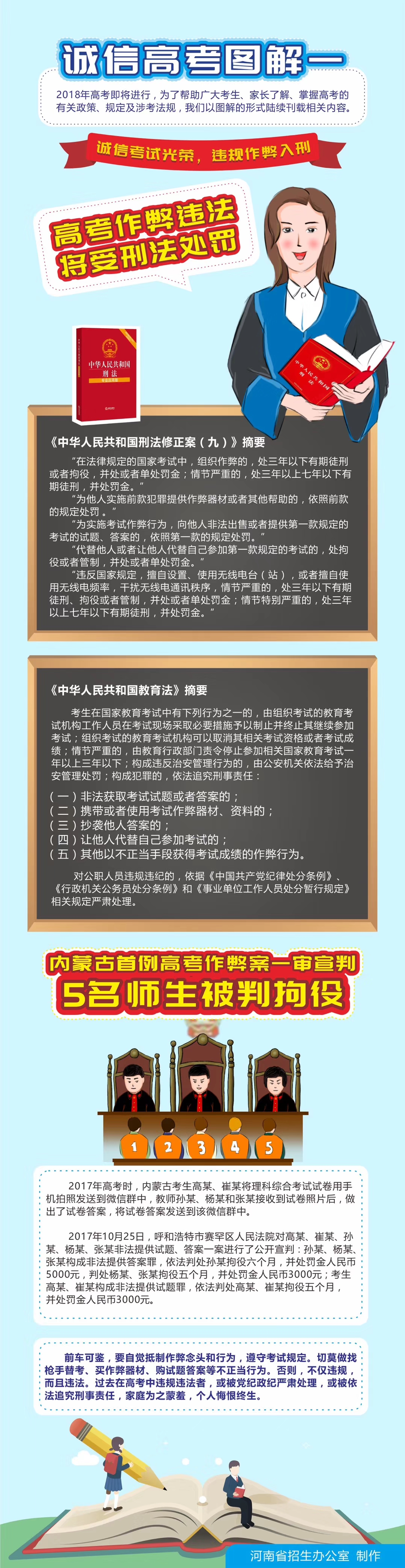 据了解,2015年11月1日起正式实施的《刑法修正案(九)》明确,在法律规定的国家考试中,组织作弊等行为将入刑定罪,最高可处七年有期徒刑。今年是“作弊入刑”新规实施后的第三次高考,省招生办发布图解,不仅介绍了相关的法律规定,还以案例的形式生动地为广大考生和家长敲响警钟。