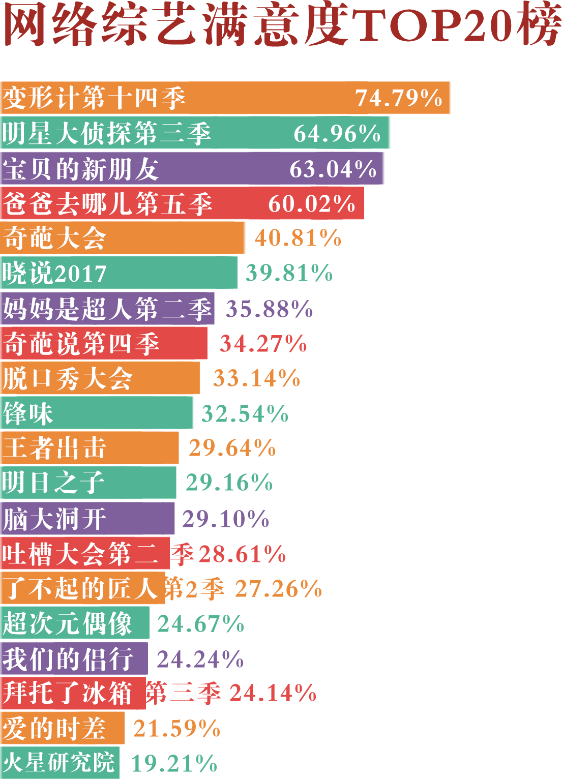 相对于传统的综艺节目,网络综艺的选材范围更广。从题材类型来看,网络综艺包含了亲子类、真人秀、歌舞类、选秀类、文化类、竞技类、脱口秀等不同主题,其中语言类节目数量可观。位列榜单第五的《奇葩大会》和第八的第四季《奇葩说》,其话题性、热点性、争议性强的特点更加突出,辩题题目多元、涉及到生活、情感、职场等与观众息息相关的领域,话题的思辨性强,现场辩手的辩论技巧和情感带入也不断将节目推向高潮。与此类似的《吐槽大会》第二季也位列本次榜单的第十四位。《吐槽大会》也是采取的脱口真人秀的节目形态。该节目的原型为美国的《喜剧中心吐槽大会》,节目的设定为话题人与圈中好友的轮番吐槽,以幽默调侃的氛围,以“段子”为主要形式,在网络综艺节目中脱颖而出,受到年轻人的喜爱。