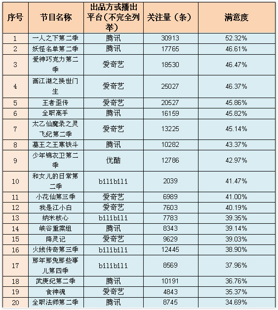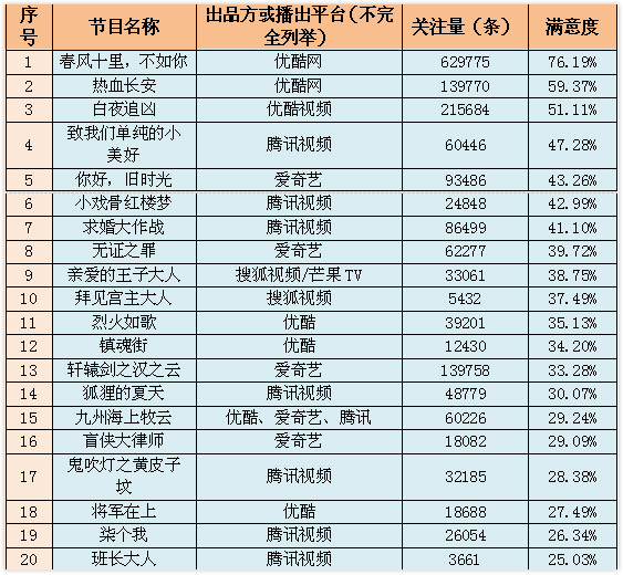 从制作和出品来看,由于竞争加剧,网络视频市场的马太效应更加明显。本次上榜的作品全是来自商业视频网站,其中以优酷和腾讯的占比最高,共同占据了榜单三分之二的位置。榜单的前三位节目分别是《春风十里不如你》、《热血长安》、《白夜追凶》,且全部出自优酷视频。制作方式是“视频网站+影视制作公司”的搭配形式,制作方都是由优酷网与两家以上制作公司联合出品,例如东海麒麟、盟将威影视、世纪影游等。