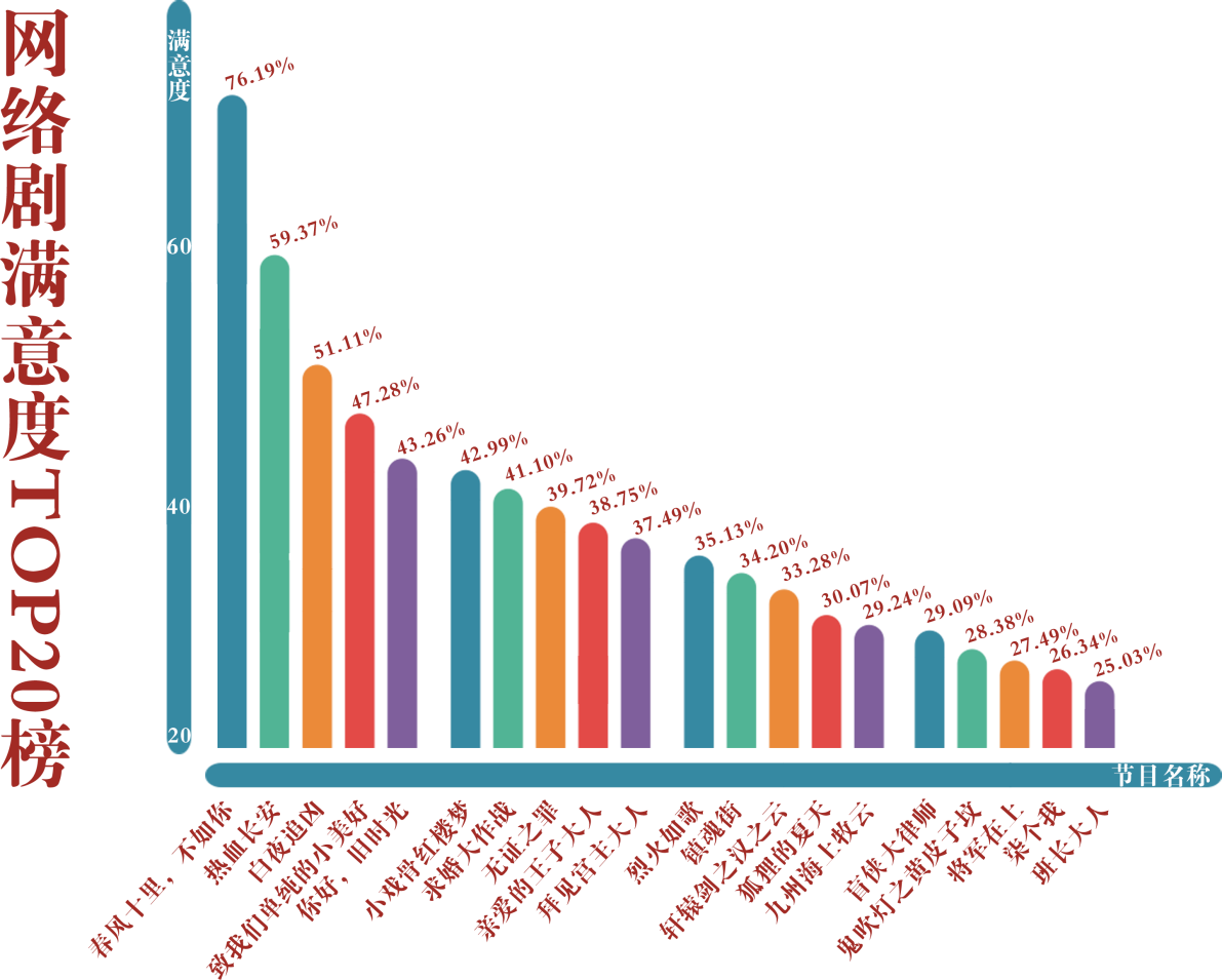 从内容选题分析,以“青春、喜剧、爱情”为主题的节目占据了榜单的半壁江山。这也凸显了网络剧依然将青年受众作为收视主体的趋势。古装剧的类型片数量有7部,也达到了三分之一的体量。近年来,国产悬疑剧也逐渐受到受众的热捧。这次上榜的以悬疑为主线的网络剧有5部。其中位列本届榜单第三的《白夜追凶》被称之为2017年的现象级网络剧,其点击率和情感分值都达到了比较高的标准,该剧还开创了网络剧向海外大范围播出的先河。悬疑、卧底、刑侦类的体裁也逐渐受到受众的喜爱,这类题材对知识性、逻辑性和专业性等的要求都比较高,因此,此类网络剧在内容选择、人物设定以及制作模式的探索都是值得肯定的。与此同时,网络剧题材的同质化问题也逐渐现象,这是与电视节目发展所面临的类似问题,因此,如何在题材上进行有价值的创新将是未来网络剧制作的一个重要思考方向。