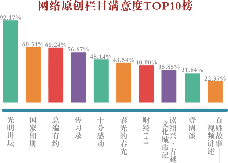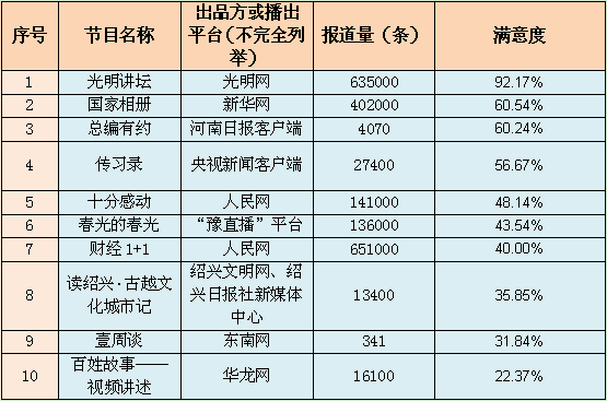 在本次榜单中,上榜作品的出版方或播出平台有一半属于央级媒体,一半属于地方媒体。排名前三的分别是光明网的《光明讲坛》、新华网的《国家相册》、河南日报客户端的《总编有约》。《光明讲坛》是光明日报和光明网联合制作的百集大型视频访谈节目。节目包含了思想理论、社会科学、教育成就、人文自然等几个板块。《国家相册》是依托新华社中国照片档案馆打造的一档微纪录片栏目,由全网播放量超过“2亿次”的现象级微电影《红色气质》衍生而来。《国家相册》每一期的节目长度为5-10分钟,以全媒体的形态呈现,用小故事引出大时代,《国家相册》是在历史的长河中,追溯故事的光影,是个人历史与国家历史的结合,在宏大叙事与个人情感中,将人性的温暖娓娓道来。人民网的《十分感动》栏目在本次榜单中排名第五,该栏目在2012年上线,并且在当年就被评为中国网络视听优秀栏目。该栏目至今已经播出了近500期,讲述普通人的感动故事,从细微处写真情,以乐观的精神反映生活,传递社会的正能量。