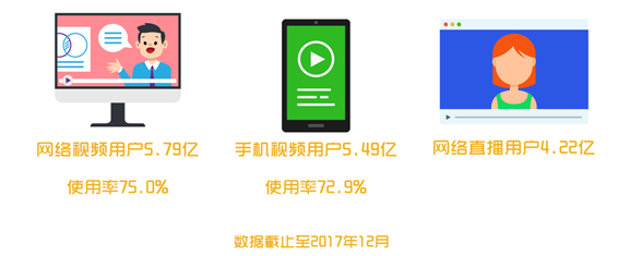 据CNNIC数据显示,截止到2017年12月,网络视频用户规模达5.79亿,用户使用率为75.0%,手机视频用户规模5.49亿,使用率为72.9%。网络直播用户的规模也达到了4.22亿。近年来,网络视频行业不断的加深其生态化和移动化,网络视频内容也不断的实现正规化和精品化。网络视频行业蓬勃发展,受众群体也不断扩大,并且呈现主要人群年轻化,并且日益全年龄化的发展趋势,单向性的传统收视习惯也逐渐转变高频率、快节奏、互动性的接收模式。多维互动的发展模式也不断推进网络视频行业和内容的创新升级。与此同时,网络视频行业也出现了垄断性趋势,优质内容都集中出现于腾讯、优酷、爱奇艺等商业网站,行业发展如同金字塔,塔尖的内容吸引了更广泛的受众,主流媒体的网络视频发展整体实力不强,发展不均衡。