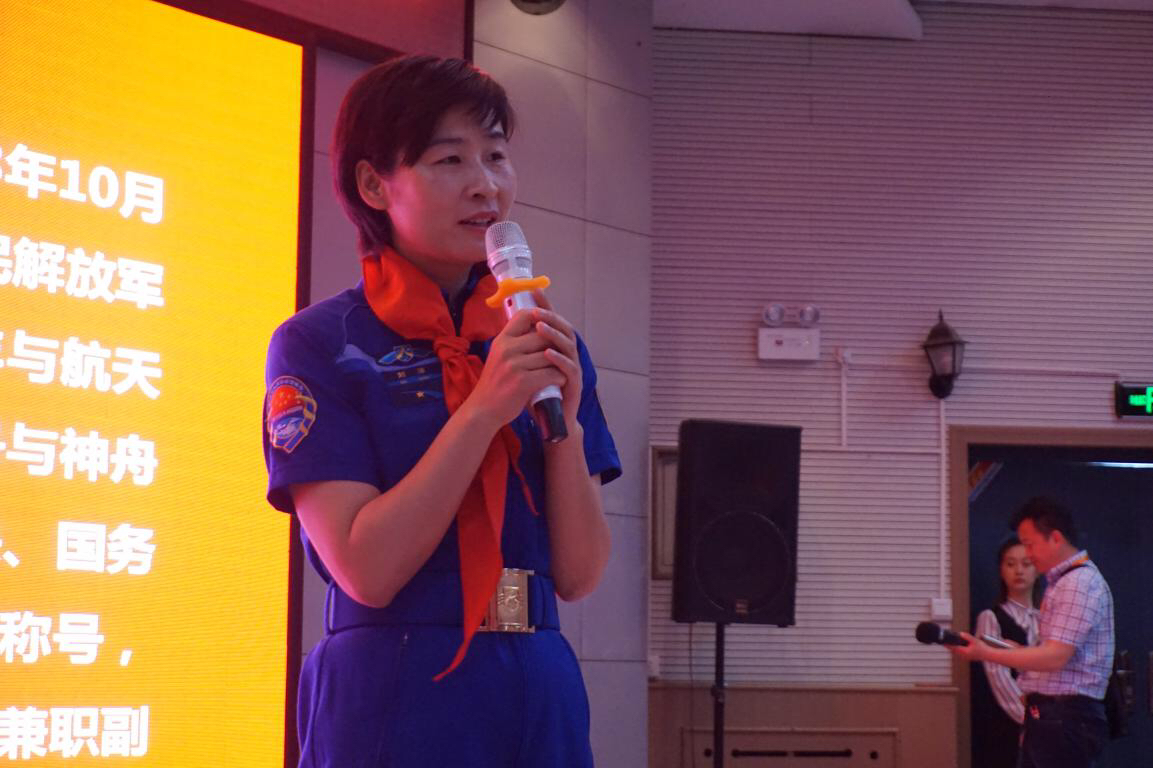 27日下午,刚刚结束沙漠野外生存训练的航天员刘洋出现在安阳市银杏南校,受到师生们的热情欢迎。刘洋向学校赠送了签名的航天科普书籍,两位学生代表为她献上鲜花并系上红领巾。