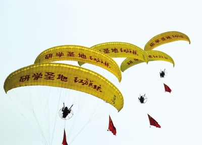 自古,林州就有良好的先天飞行条件。5月26日上午,在这片红、绿、蓝交相辉映的沃土,身着“研学圣地红旗渠”的五架七彩动力滑翔伞时而一掠而过,时而盘旋上空,红旗渠红色研学游与蓝天滑翔游、绿色生态游交相辉映,向世界展示了红旗渠腾飞中的新姿态。
