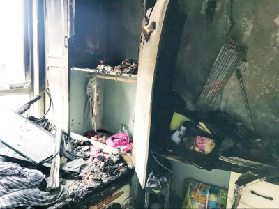 30日上午10时许,记者来到事发的5号楼,发现楼东侧是个大坑,北侧则是一片碎砖瓦砾,整栋楼像处于一片施工工地中间。上到28楼,发现这里的手机信号非常弱,时有时无。这里一梯五户,起火的房间是个89平米左右的小三房。透过敞开的防盗门,可看到里面一片狼藉,到处是烟熏火燎的痕迹。室内,最里侧的书房可看到电脑桌以及紧挨着的柜子及床上的织物都被烧得一塌糊涂。