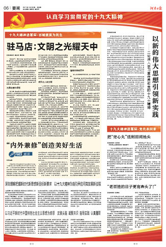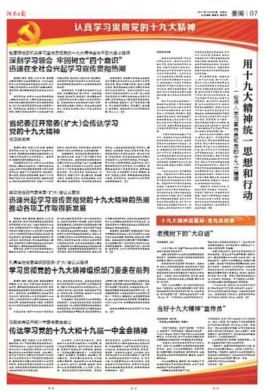 党的十九大报道浓墨重彩。宣传好、贯彻好、落实好党的十九大,是贯穿2017年全年的首要政治任务。河南日报高起点谋划、高标准要求、高水准运行,十九大宣传报道在规模、质量、形式、模式、效果上实现了多项突破。持续开展“五大理念引领发展”“砥砺奋进的五年”“新时代新气象新作为”等重点报道纵贯全年;会前陆续刊发的超越地域的十篇大型系列述评《牢记嘱托出彩中原》,深刻诠释了“总书记怎么说,河南怎么做”的主旨要义,“点河南的题、破全国的局”,纵横捭阖、气势恢宏,阅读量突破3.3亿人次,被誉全国省级党报同类报道中的扛鼎之作,中宣部赞扬“有高度、有深度、有温度”;一条红飘带串起的十九大报告解读版颇具创意,厚重大气的“报中报”连天接地、凝心聚力;连明彻夜奋战72个小时,在全国省级党报中率先推出8个版的十九大报告学习体会文章,被业内称为一次精彩的“理论快闪”;“一日一课”、“十九大代表在基层”等栏目持续升温,党报媒体“风向标”“压舱石”“定盘星”作用得到更加彰显,有力地推动党的十九大精神在河南落地生根。