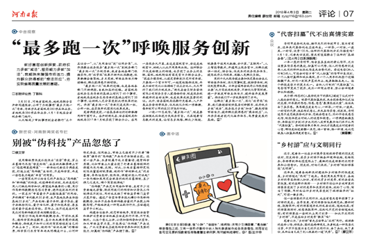 关注民生热点话题。河南日报的民生类报道一直呈现数量多、质量高、接地气、重服务的良好态势,客观真实地反映老百姓生活中遇到的难点、热点,探讨百姓关心的衣食住行等问题。对于重大热点问题,采取“重点报道+专栏报道+评论报道”的模式进行突出处理,体现小切口、大主题,“关注优秀民间文化保护与传承”系列报道以及《为了那一抹跨越千年的天青色》《三门峡市实行建筑领域农民工工资监管破解“讨薪难”的新探索》《扶贫,扶志也要扶智——唐河县“轮椅兄弟”电商脱贫路的调查》《破解因病致贫返贫难题的镇平探索》等一系列深度调查取得了良好的社会反响。在报纸上持续公布热线电话、电子信箱、热线QQ等多途径征集民生热点话题,并在“来函照登”、“基层传真”等栏目中展示读者的观点与建言,为百姓提供“发声”渠道,答疑解惑。