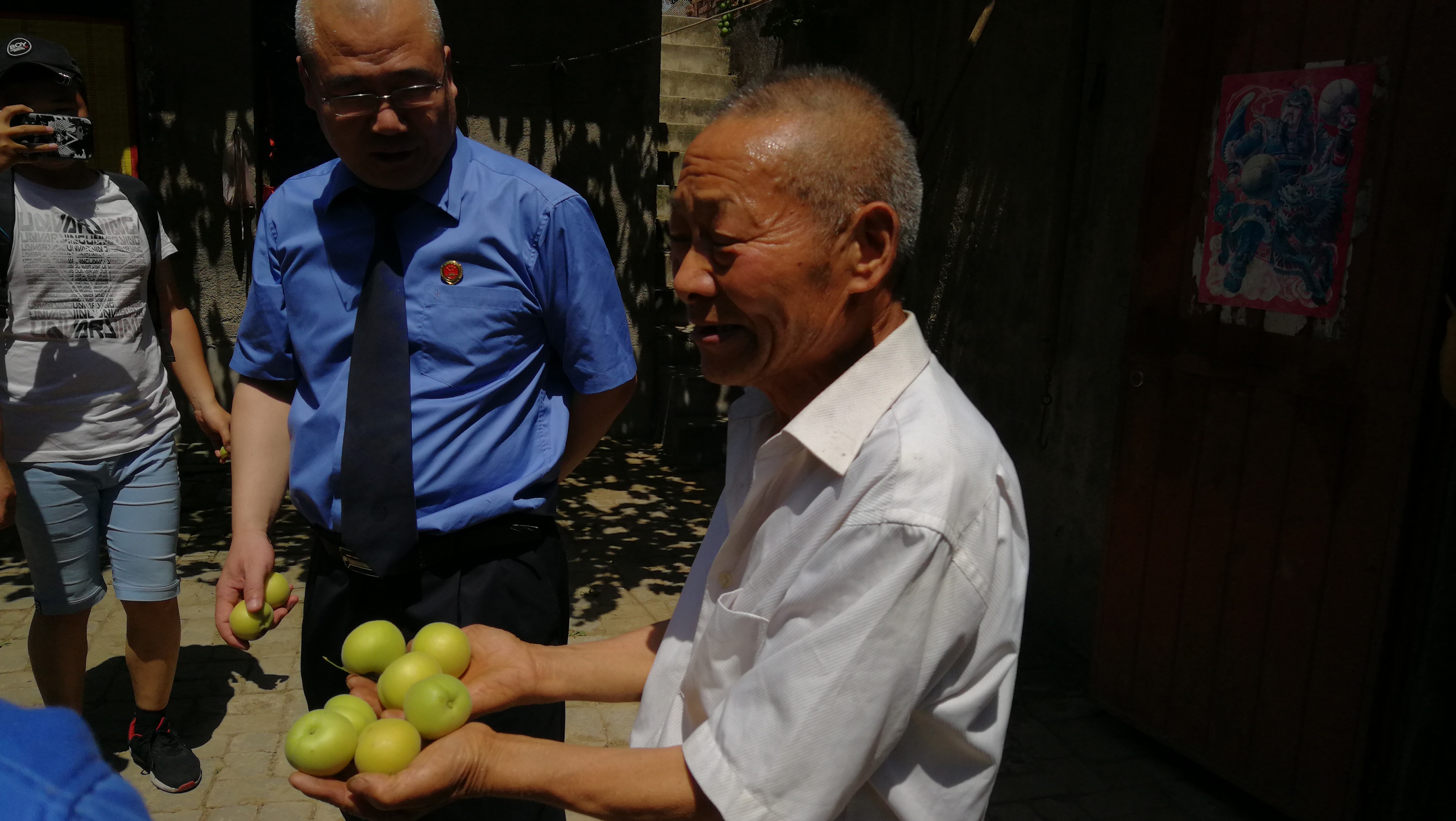 村里的李新奇两口子都是残疾人,推开这对老夫妻的家门,宽敞的大院里干干净净,院右侧葡萄架上的葡萄像一颗颗绿珍珠。看到穿着蓝制服的人来了,抑制不住激动的李新奇从院外自家杏树上摘了满满一捧杏子要分给大伙。